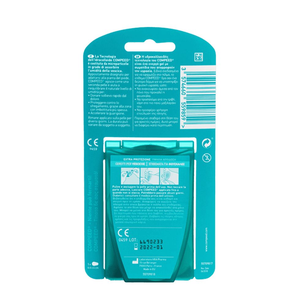 La tecnologia idrocolloidale Compeed® consiste in un gel attivo con particelle che assorbono l’umidità. La spessa struttura ammortizza e ridistribuisce la pressione sulla vescica offrendo un sollievo rapido dal dolore. Compeed® ha un bordo creato in modo che aderisca uniformemente alla pelle. Ciò riduce l’attrito in modo che il processo di guarigione non venga interrotto da uno sfregamento doloroso.