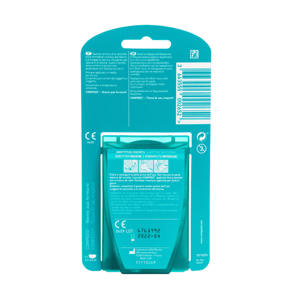 Le vesciche richiedono diversi giorni per guarire. i trattamenti consistono nel proteggere la vescica da ulteriori attriti- si consiglia di applicare un cerotto come Compeed® per prevenire ulteriori vesciche e fornire un sollievo rapido dal dolore.