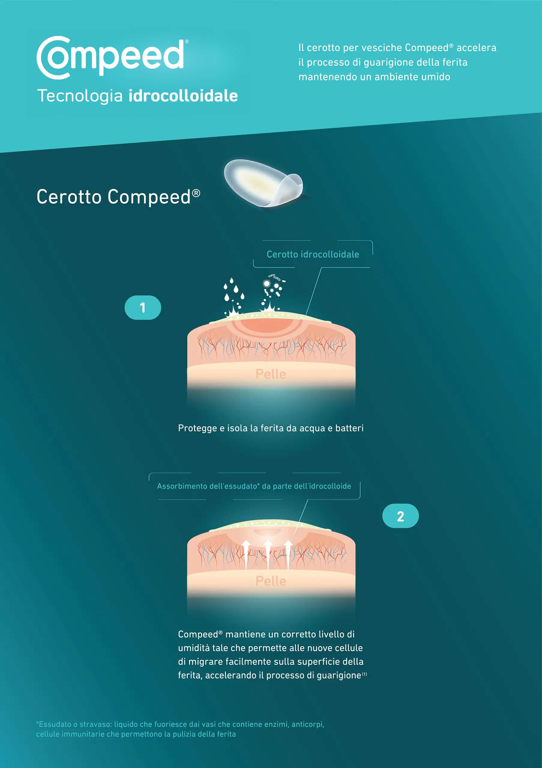 - Per risultati migliori: utilizzare il cerotto idrocolloidale Compeed® fino a completa guarigione. Utilizzare Compeed® Cerotti Idratanti Per Calli anche per prevenire l’accumulo di pelle indurita, tipica della formazione di calli e duroni.